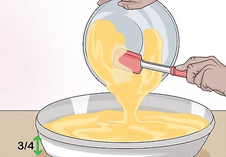 Pour the batter into the prepared baking pans. Fill each pan about ¾ of the way with cake batter. You will have some cake batter left over. You can use this to make another cake or a set of cupcakes. Use a rubber spatula to scrape the bowl clean so that you don't waste any cake batter.