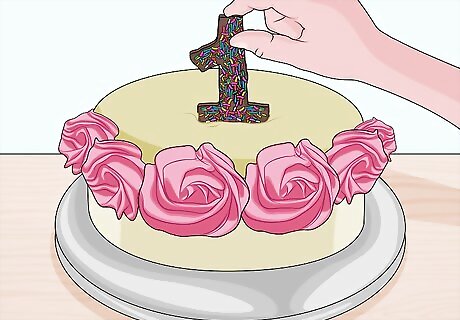 Finish off with some sprinkles, if desired. You don't have to do this, but it's a great way to bring some color to your cake, especially if you spread the frosting instead of piped it on. Plus, your little one might like the texture when he or she grabs the cake! Instead of going for the basic rainbow sprinkles, consider using something more creative, such as silver hearts, gold stars, or edible glitter.