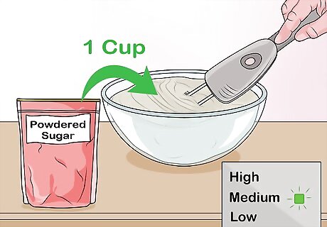 Beat in the sugar gradually. Add in 1 cup (125 grams) of powdered sugar, then beat it in using a medium speed setting. Add in the remaining cup (125 grams) of powdered sugar and beat it until it is completely blended in.