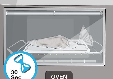 Microwave the piping bag until the chocolate melts. Place the piping bag into the microwave, then heat it at 30-second intervals until the candy melts. Knead the bag between each interval. How long you do this for depends on the type of candy melts you are using; some melt quicker than others.