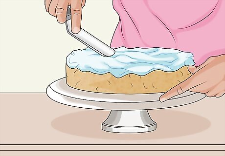 Fill a piping bag with the frosting. Cut the tip off of a piping bag, then insert an open star decorating tip. Set the bag down into a tall glass, then fold the top edge over the rim of the glass. Fill the bag with the buttercream frosting using a rubber spatula. Skip this step if you want to just spread the frosting over the cake for something simpler.
