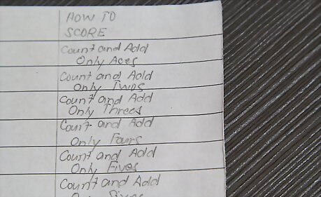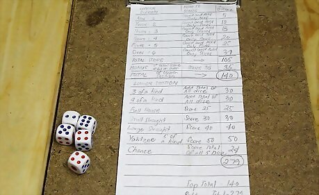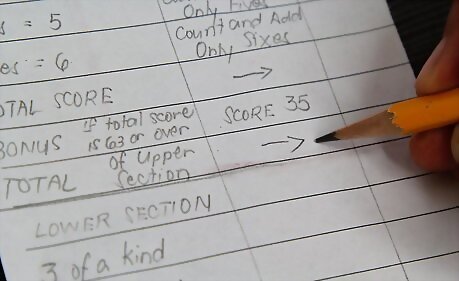 Play your game and write down your scores you score for each round of three rolls on the row on the paper.. Each successive column, will have your final scores. Record your scores in each successive column.