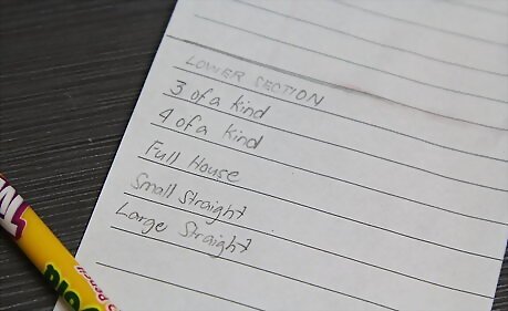 Write down the reminder items of point totals for each of the items on their own separate columns. As long as you realize that the top 6 items are only a total of total amount of successful dice that fit the category, write down "Multiply by (x-number written on line) for each number of dice thrown" for each line. The official scorecards say "Count and only 1s(they call them Aces), 2s, 3s, and so-forth). Bonuses for the total amount of points adds 35 points to the score at the end. Remind yourself of this fact, and write an area after the 1-6's that have totals for upper section and the bonus points (which, according to an official scorecard, says If score is 63 or over, and on next column write "Score 35". Add another line for the grand total of the top portion of the page. The special rolls area below has special rules. 3-of a Kind is the total number of points scored on all dice. Write down this information. 4-of a Kind is (again) the total number of points scored on all dice. Write down this information too. Full House has a flat-rate score of 25 points, so write down "Score of 25" as a reminder. Small-straights, which are a sequence of 4 successive dice, have a flat-rate score of 30, so write down "Score of 30" as a reminder. Large-straights, which are a sequence of 5 successive dice, have a flat-rate score of 40, so write down "Score of 40" as a reminder. Yahtzee, the best rolls in the game, have a flat-rate score of 50, and can be achieved when all 5 dice display the same exact number of each and every one of them, so write down "Score of 50" as a reminder. Chance is the sum/total of all dice, so leave the next column blank. You can also flip the placement for Yahtzee and Chance around, and add Yahtzee bonuses, if you feel you might be able to get more than one Yahtzee (a rare occurrence for most players). Each extra Yahtzee bonus has a score of 100 per Yahtzee Bonus earned. Write down this scoring point total as a reminder, and create a space for amount of checkmarks you might earn. Realize that each checkmark though corresponds to one and only one extra bonus item