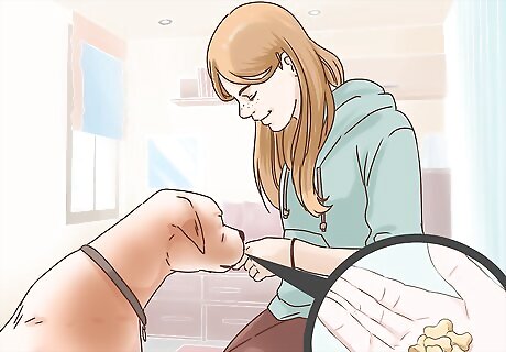 Give the dog treats to encourage them inside. If your dog is resistant or nervous about coming inside, use positive reinforcement. Connect being inside with treats and praise. Put treats in the doorway or lay down a line of treats to entice your dog inside. Once inside, give them another treat and lots of praise and love to help them learn that being inside the house is a good place.