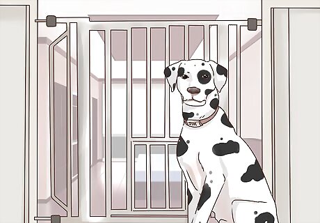 Keep your dog in a designated area until they adjust. Some dogs will immediately adjust to being inside. Others may take more time. If this is the case, consider keeping your dog in a dog-friendly room or a crate when you are not home. You may also use baby gates to keep the dog in certain rooms. This helps the dog stay out of trouble when you are not home. For example, your dog won't have an opportunity to mess in the floor or chew up furniture if you place them a specific room. Leave the dog toys and fresh water when you are gone. You may consider picking up food, though, if your dog is not used to free-feeding or has a tendency to overeat.