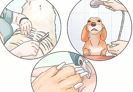 Keep your dog groomed. When you bring your dog indoors, you want to make sure they stay clean and groomed. Give your dog regular baths. Comb and trim their hair if they are a long haired breed. Keep their nails clipped. If you don't want to do all of this yourself, you can take them to the dog groomers. If your dog has fleas or ticks, you can talk to the vet about medication to help get rid of them.