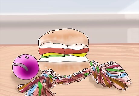 Get your dog toys. When you bring your dog indoors, you should get some toys for your dog, or bring in any favorite toys your dog had outside. Without toys, your dog may get bored. Dogs need mental stimulation, and toys helps keep them entertained. Dogs also love to chew, and toys gives your dog something to chew so they don't chew on furniture, shoes, or household objects.