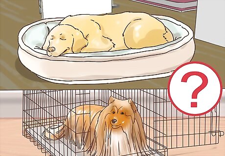 Give your dog a sleeping spot. When you move your dog indoors, you should decide where it's going to sleep. Many experts suggest letting your dog sleep in a crate because it gives them their own space. Some people give dogs a bed in their room. Determine where you want your dog to sleep and show them that each night. Don't let your dog sleep on furniture if you are not going to want them to always sleep on furniture. Make the rules about where the dog sleeps clear when you bring them indoors, and be consistent to help promote good behavior.