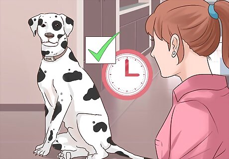 House train your dog. One of the things you'll have to do when you bring your outdoor dog indoors is house train them. They are used to going to the bathroom whenever and wherever they want, so they have to learn to only go outside. Take your dog outside to use the bathroom in the morning, before bed, after meals, and any other time you think they may need to go. It may help to take your dog out more often initially, every two to three hours, to help your dog adjust. Reward your dog's good behavior with treats and positive praise. Pick a treat that your dog greatly enjoys, and be sure to reward them as soon as they have relieved themselves. Don't wait until your inside, or your dog may not understand the reward.