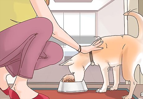 Use food to bring the dog indoors. Another way you can help encourage your dog to come inside the house is to use their feeding time. You can use the feeding time to slowly bring them inside and help them get used to the new environment. Feed the dog on a mat outside. Once they get used to eating on the mat, place the mat just inside the door. If your dog won't go to the bowl, put a leash on them and bring them inside so they can eat. As the dog gets more comfortable, move the mat further and further inside the house.