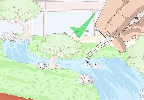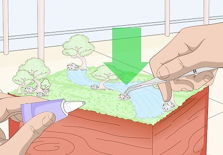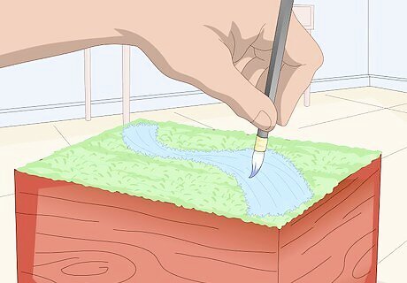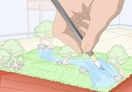 Add a stream. Use a blunt object, like the end of a foam brush, to scrape off some of the grass and create a stream. After you have created your desired stream shape, apply a thin layer of glue to either side in order to create a border to seal in any water you may with to add.