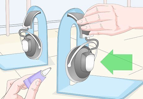 Set the headphones on the bookends. Take each half of the headphone and set it on its own separate bookend. Take note of where the natural points of contact are and apply a few drops of glue to these areas. Press and hold the headphones in place as your wait for the glue to dry. Work on one side of the headphone at a time for convenience. You don’t want to apply too much glue and make a mess. Use a clean swab to wipe off any excess glue after you have pressed down on your headphones.