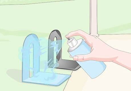 Spray paint your bookends. Purchase some metal utilitarian bookends from your local dollar store and spray paint them. Choose a colour that suits the colour of your headphones or you may also spray paint your headphones the same colour for a monochromatic look. Allow your spraypaint several hours to dry. Make sure to apply your spray paint evenly. You may want to practice against some scrap pieces of board to get use to the paint distribution.
