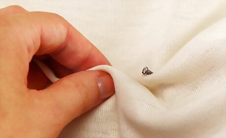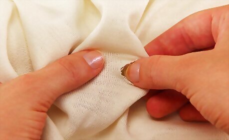 Yank the fabric up over the head of the nail. This will create a small round tear in the fabric.
