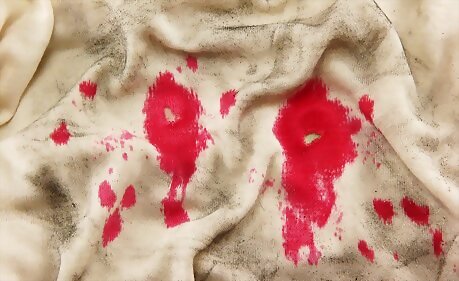 Paint the holes with blood. Use a small makeup applicator or paint brush, and consider what the blood drips and smears would look like. In a sweater or jacket, the blood would just absorb into the fabric. If the bullet holes are in a lighter material or closer to the skin, like this tee shirt, the blood would drip some before absorbing.