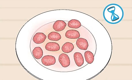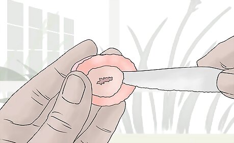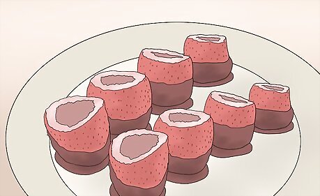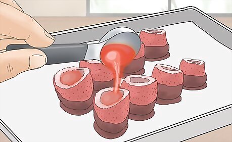 Hull your strawberries. Using your dominate hand, stick the inch of a pairing knife near the strawberry's stem at a 45 degree angle. Carve the knife around the stem in one direction and then repeat in the other direction. The core of the strawberry should come out on its own, leaving a small hollowed out area in the strawberry you will later fill with jello.