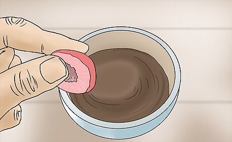 Dip the strawberries in the chocolate. Once your chocolate is melted, your strawberries should be drained. One by one, hand dip them in the chocolate-mixture tip first. Coat the strawberries completely in chocolate. Set the strawberries, cut-side down, on a baking tray covered in parchment paper after dipping them.