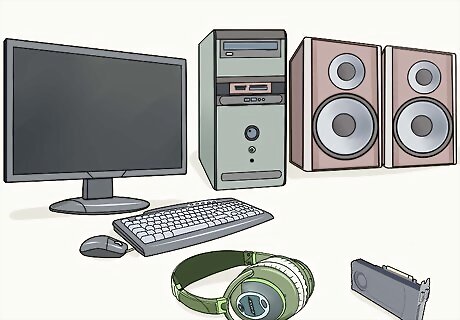 Pair your computer with good sound equipment. You can make perfectly good electronic music with the sound chip that came with your computer and inexpensive speakers. However, if you can afford it, you should consider one or more of the following upgrades: Sound card. Using a sound card designed for making electronic music is recommended if you plan to do a lot of external recording. Studio monitors. These are not computer monitors, but rather loudspeakers designed for studio recording. (“Monitor” in this sense means that the speaker accurately reproduces the source audio with no or minimal distortion.) Lower-cost quality studio monitors include those made by M-Audio and KRK Systems, while higher-end monitors include those made by Focal, Genelec, and Mackie. Studio-grade headphones. Listening through headphones instead of speakers lets you concentrate on individual parts of your song better, helping you track rhythms and sound levels. Studio headphone manufacturers include Beyerdynamic and Sennheiser.