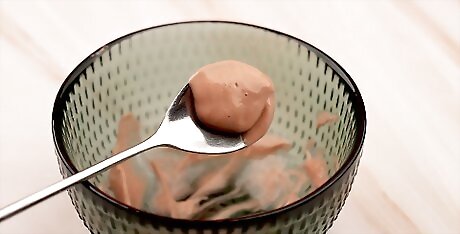Use a spoon to check the consistency. See how quickly the foundation runs off of a spoon. This will determine if it is too thick, too thin, or just right. Scoop a small amount of foundation with a spoon. Tilt the spoon so it is mostly upright. If the foundation runs off the end quickly, it is too thin and needs more eye shadow added to the mixture. If the foundation sits on the spoon and barely moves, add more moisturizer. If the foundation slides from the spoon at an easy, slow-to-medium pace, it is a perfect consistency.