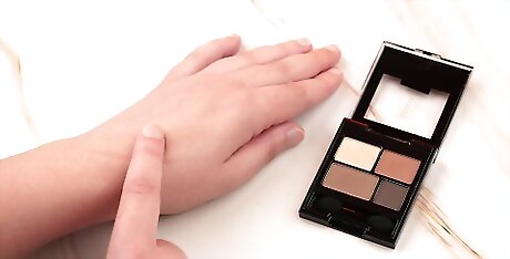 Test it in the store. You want to be sure to select the right shade, so it is important to test the eye shadow in the store before you purchase it. Use your finger to rub a small amount of the eye shadow onto your face or hand and blend it in. A matching color will disappear on your skin. Select an eye shadow that is one shade darker than a direct match. Also, when testing, remember that your hands may be tanned darker than your face.