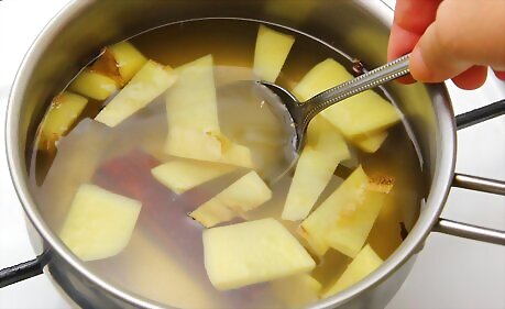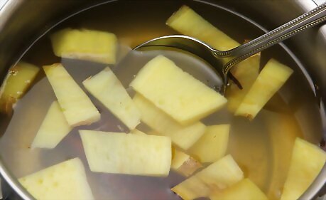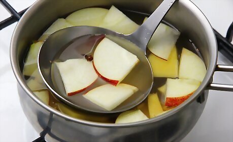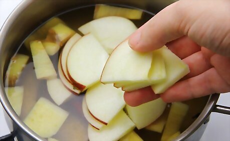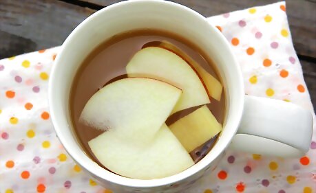 Slice the apples. Add the slices to the simmering cider or juice in the last one to two minutes of cooking, then remove from the heat.