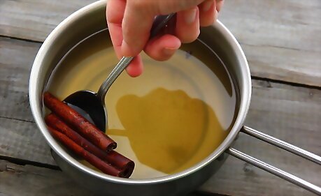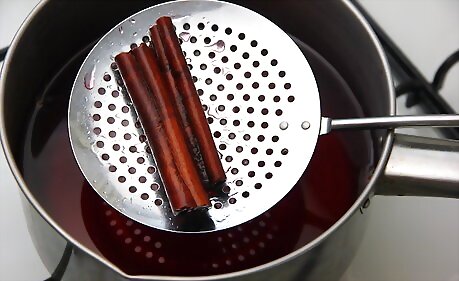 Use a slotted spoon to sift out the cinnamon sticks and cloves.