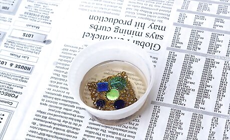 Arrange the metal, crystals, and other items in your molds. While you wait for the resin and hardener to warm up, place a layer of aluminum, copper, and crystal into your molds along with any other precious gems or stones that you would like to include. Arrange these items in a manner that is pleasing to you.