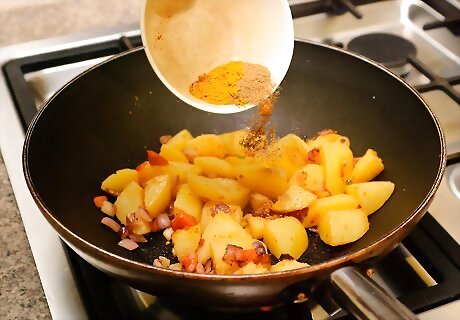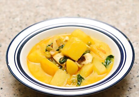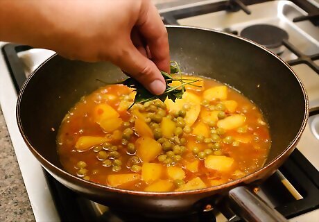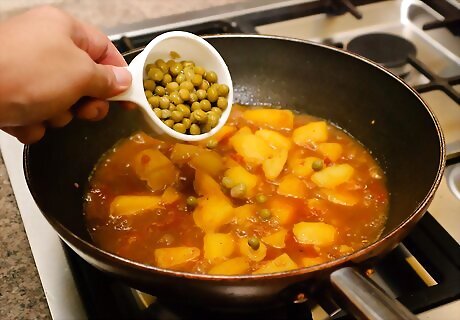 Add peas. Potato curry can be complemented by many different types of spices, proteins, and vegetables. Try adding one cup of fresh cooked peas in the saucepan, and mix with the potatoes and spices.