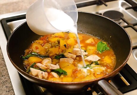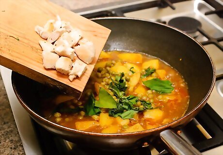 Mix in chopped spinach. Chop two cups of fresh spinach, and add it to the potato curry as it is cooking on the stove. Mix the spinach in well with the other ingredients.