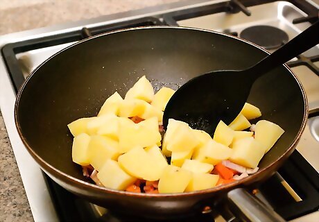 Put in the potatoes. Stir them in with the other ingredients, and let them fry for three to four minutes. Stir often so the potatoes get cooked and browned evenly.