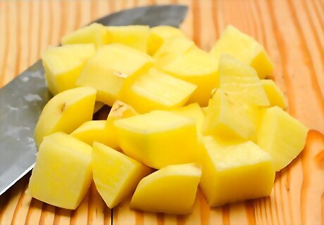 Peel the potatoes and cut them into quarters. Once you have finished quartering the potatoes, boil them in water for about 15-20 minutes until they are soft.
