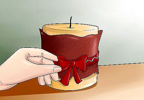 Wrap candles to make them fancy . Starting with tall, plain pillar candles, it's easy to end up with beautiful and desirable home decorating items that are likely to sell well. Choose unscented white candles for the most versatility, or make scent and color substitutions as you see fit depending on the items you intend to wrap the candles with. Take a vanilla or unscented pillar candle and some twine or a thin leather thong. Prop sticks of cinnamon up against the candle and tie them to the candle with the twine or thong. The cinnamon will warm up and smell lovely when the candle is lit. Take a rectangular strip of sackcloth and a scrap of patterned linen. Cut the scrap down so that it's about as tall as the strip is wide, and then cut a simple shape out of it with fabric scissors. (Fold it in half and cut out half a shape to get a symmetrical piece.) Use a bit of hot glue or another strong adhesive to glue the colorful shape to the sackcloth, and then tie the ensemble around a pillar candle with some twine. Take a squat Mason jar with a wide mouth, such as a Ball wide mouth pint canning jar, and glue the bottom of a plain glass-cup candle inside it. Fill the space between the candle and the Mason jar with flattened glass gems (“dragon tears”) in combinations of one or two colors. The colors will light up beautifully when the candle is lit.