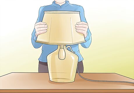 Make a glass jug lamp. Start with a large glass bottle or jug. These can be found in junk and antique shops, as well as from thrift sellers and garage sales. Pick something big enough to make a decent table lamp. Next, buy a bottle lamp kit from a craft store; these vary in price from around $12 – 35. You should at least get a lightbulb assembly with a cork (to fit into the mouth of the bottle or jug) and an AC cord with a plug. Install the kit and finish with a cheap thrift-store lampshade. Typically, to get the best-looking lamp, you'll have to drill into the glass to run the cord through. Doing this properly requires a power drill and some patience. Be careful to follow all safety instructions and work slowly to prevent shattering the glass. You can spice these lamps up even further by decorating the interior of the jug before you fasten the lightbulb socket. Try adding pretty stones, or use thin glue and glitter to make the lamp sparkle from the inside. Using colored glass is also a great idea.