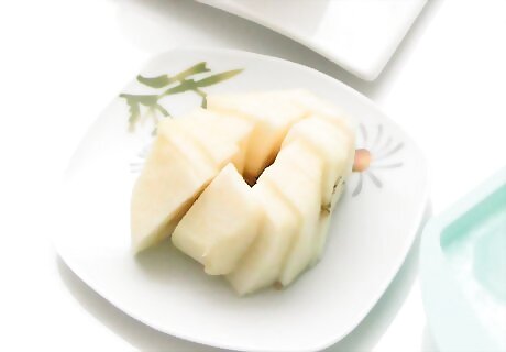 Prepare the pear. Take a whole pear and peel it. Then core it with a spoon to remove the seeds. Finally, use a knife and cutting board to chop it into half-inch (1.27 cm) sized pieces. You can buy seedless pears if you do not want to waste time removing the seeds.