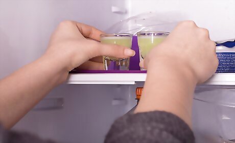 Prepare the shot cups. Make individual rows of 2-ounce plastic shot cups on a baking sheet.