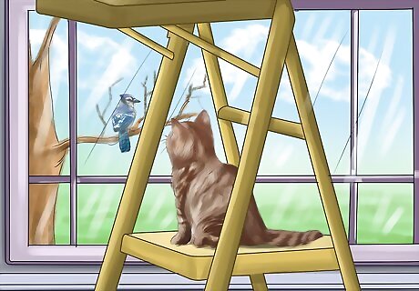 Construct or purchase a cat tree. Cats love to watch and hunt small animals such as birds. They can watch and “hunt” from a window but you may be concerned about your cat being in the window. Make or buy a “cat tree” so that your cat can watch birds, squirrels and other small creatures. This may be an especially great way to amuse indoor cats, or outdoor cats that may be inside. Make your “cat tree” using things you have around the house. You may also want to consider building an actual “cat tree” with different level perches. Most pet stores also sell pre-fabricated “cat trees.” Place the “cat tree” near a window where your cat likes to sit. Having the different perches will give her different types of enjoyment that a window seat can’t provide. Open blinds or curtains so that your cat can watch what’s happening outside. Your cat may have so much fun that it makes noises or lunges at the window to “capture” prey. Add features such as branches or hanging toys to make the cat tree interesting.