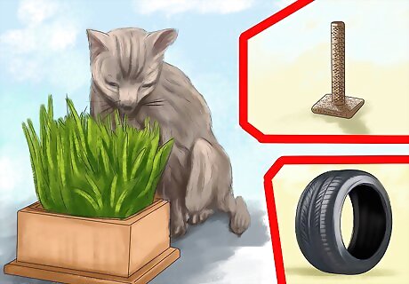 Bring the outdoors in. If your windows aren’t safe for your cat, try bringing some of the outdoors inside for it. Provide your cat any of the following to give it the enjoyment of the outdoors without sitting in the window or going outside: Cat grass, which you can purchase or grow yourself Pesticide-free alfalfa Bird seed Catnip Tires Toys hanging from branches, especially life-like birds Videos of birds or other animals Scratching pad made of natural fibers such as sisal