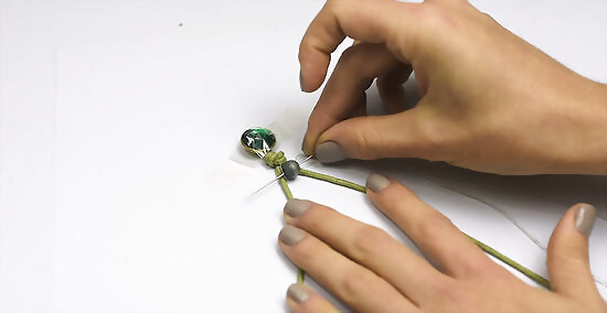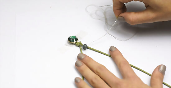 Slip the needle back through the bead. After you wrap the thread around the right side, come back through the bead from the other direction. Tighten the thread up so that you pull both sides of the cord tight around the ends of the bead.