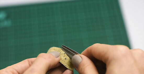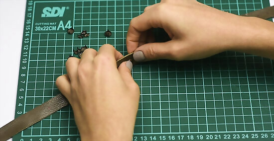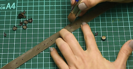 Insert brass studs meant for paper. Push the stud through the slit you just made. Open the prongs, laying them flat against the back of the leather to secure them in place. Repeat the process with the rest of the studs.