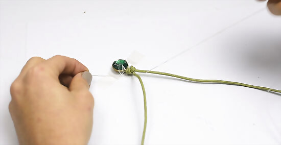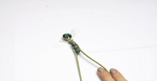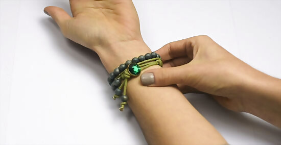 Add a bead to each end of the cord and tie them off. Measure 2–4 inches (5.1–10.2 cm) below the last knot on 1 side of the cord, and place the bead there. Tie an overhand knot just under the bead. Do the same on the other side. These beads will dangle below the bracelet for a decorative effect. However, if you don't want to make this part, cut the cord off just below the second knot you made with both ends of the cord.