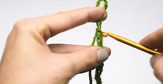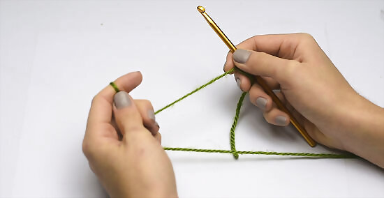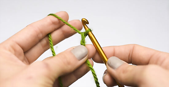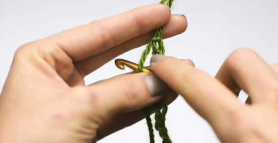 Wrap the thread from the hook around the fingers on your left hand. Hold the hook in your right hand. Starting 2 to 4 inches (5.1 to 10.2 cm) above the knot, wrap the thread over your left pointer finger and weave it through your fingers. Wrap it once around your pinkie. This process helps create tension so that you can easily pull the thread through the loop. Use your pointer finger to hold the thread up away from the knot to create the tension. As you need more thread, let it flow through your fingers.