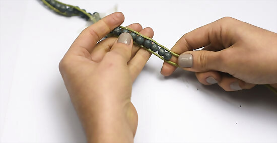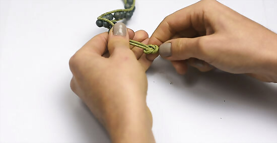 Wrap the thread around the left cord and repeat the process. Go around the left cord, then slip the needle through the next bead. Go around the right cord, and push the needle back through the bead. Wrap it around the left cord, and continue the process. Keep going until the bracelet is the length you want. Wrap it around your wrist to check the size.
