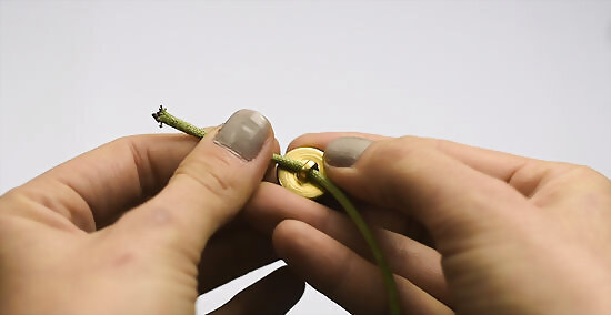 Thread a button onto the cord. If your button has 2 holes, thread the cord up through 1 hole and out the other, then pull the cord so the button is in the middle. If it has 4 holes, thread it up through one hole, and down through the hole that's diagonal to it. Thread it up through another hole, and down through the hole that's catty-cornered to that one. The cord should come out the bottom of the button when you're finished. Make sure the button is centered on the cord. Some buttons also just have a small shank on the back for the cord to go through.