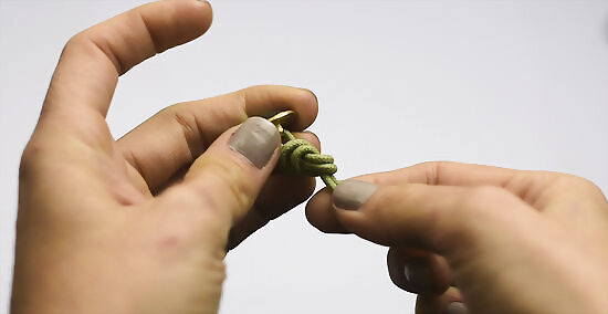 Make an overhand knot in the cord just behind the button. To make an overhand knot, treat the 2 lengths of cord as a single cord. Wrap the 2 lengths of cord around themselves to make a loop. Pull the ends of the cord through the loop on the other side, then tighten it up to form the knot. As you tighten the cord, pull it up toward the button so the knot sits just behind it.