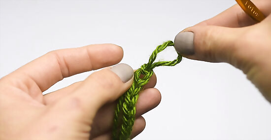 Slip stitch into the first chain stitch on the other side of the big chain. Insert your hook in the chain between the 2 threads on top and the 1 thread on the bottom. Loop the main thread around the hook on the other side and pull it through the chain stitch back toward you. Continue pulling the thread through the loop on your hook to finish the slip stitch.