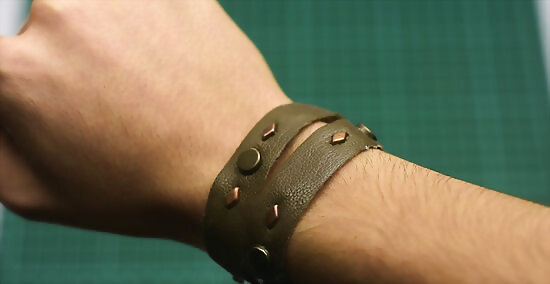 Create a closure with a final stud. Insert the stud at one end of the leather. Instead of flattening the prongs, fold the ends back on themselves, working towards the outside. You should have 2 little loops and a fairly loose stud. Cut a small slit in the other end of the leather. Put the top of the stud through the slit to close the bracelet. If the stud won't fit through the slit, make it bigger.