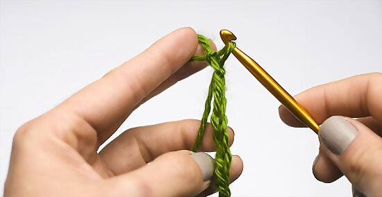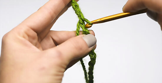 Prepare to go back along the chain. Hold the chain in your left hand (along with the thread woven through your fingers). You should see a series of Vs. If you don't, flip the chain to the other side. Locate the chain stitch that's just on the other side of the big chain stitch. Within the chain, you should see 2 threads on top and 1 across the bottom.