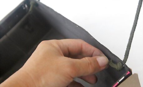 Loop the rope over the top of the closet rod, and bring it through the front slit. Knot the rope and cut off any excess. Although the fabric will hold your boxes together, the rope will keep it from moving or falling when weighted down with clothes.