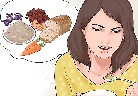 Add more fiber to your diet. Eating food high in fiber (veggies, whole grains, beans, legumes) tends to fill you up so you don't over-eat and risk developing hyperglycemia. Fibrous veggies (celery, carrots, zucchini) also tend to be very low in sugar, so they won't spike your blood sugar levels — assuming you lay off the veggie dips and processed cheese! Some fibrous fruits can be relatively low in sugar and make good choices also, such as strawberries and apples, but make sure they're not too ripe because the sugar content will be higher. Instead of white rice and white bread, eat more brown rice and whole wheat bread with flaxseed or nuts. High fiber diets also keep blood cholesterol levels low and stimulate better digestion and colon health. According to the Institute of Medicine, women need 25 grams of fiber per day whereas men need 38 grams of fiber per day.