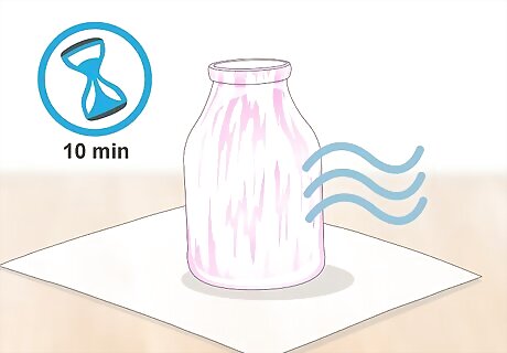 Set the bottle upright on a paper towel and let it dry for about 1 week. After a couple of days, insert a wooden skewer into the bottle, poke the bottom, then pull it out. If the skewer comes out clean, the paint is dry and the bottle is ready to use. If it comes out colored, the paint is wet and needs to dry longer. Leave the bottle alone for a couple more days before checking it again. It may take longer for the paint to dry, especially if it is humid where you live. If you made a marbled jar, turn it upside down on wax paper to drain the excess paint first, then let it dry upright. This could take at least 1 day.